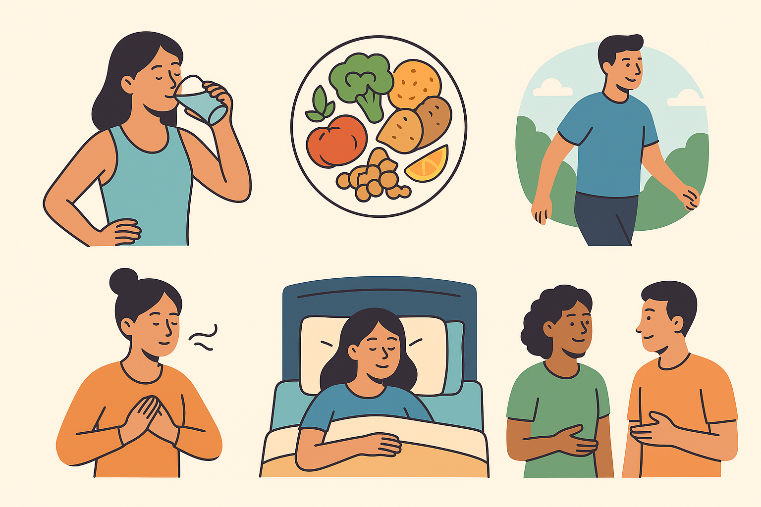 Aim for at least 30 minutes of walking, stretching, or light exercise daily. Regular activity boosts your mood, supports heart health, and helps maintain a healthy weight.